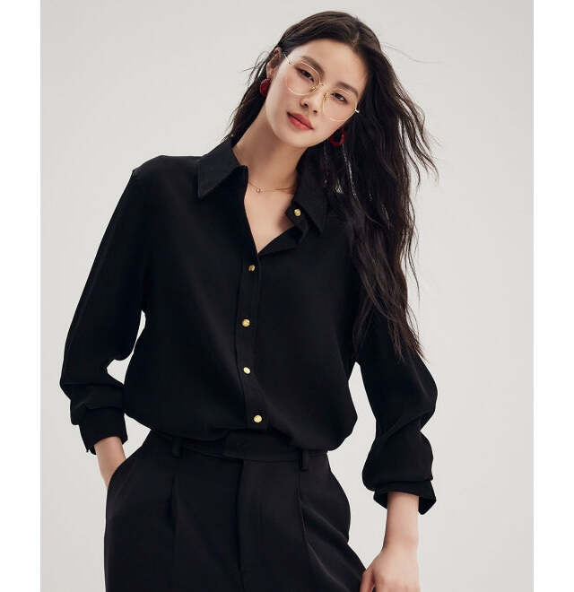 柔らかい光沢感のあるアセテート素材が、動くたびにさりげない艶めきを放つエレガントなブラウス。ゴールドボタンがアクセサリーのような存在感を放ち、1枚でも主役級の華やかさです。ジャケットやカーディガンのインナーとして取り入れると、さりげなくゴールドが覗いて上品な輝きをプラス。タイトスカートを合わせれば、オフィスにも馴染む知的スタイルに。