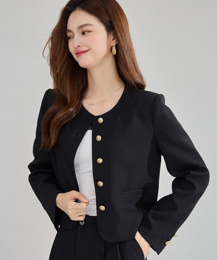 すっきりとしたノーカラーデザインに、煌めくゴールドボタンがアクセントになったショート丈ジャケット。コンパクトなシルエットがウエストラインをきれいに見せ、ハイウエストボトムとの相性も抜群。デニムを合わせれば抜け感のある“都会的カジュアル”に、ワンピースの上に羽織れば“クラシックフェミニン”にも仕上がります。どんなスタイルにも上品な華やぎを添えてくれる万能アウターです。