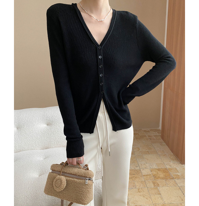まずおすすめしたい1着は、今の季節にちょうどいい長袖のカーディガン。カラーは合わせやすい黒をチョイスすれば、ボトムスとの相性を選ばずに着こなせます。首元からインナーをチラ見せできるVネックで、レイヤードスタイルもお手の物。大きすぎず小さすぎないサイズ感なので、きちんと感も演出できます。