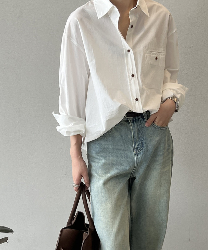 次におすすめしたいのは、シンプルな襟付きシャツ。羽織り物としてもトップスとしても気回せるので、ワードローブに1枚あると便利なアイテムです。こなれ感の出るルーズなシルエットが、野暮ったく見えないポイント。ベーシックなアイテムなのに、ラフに着るだけでおしゃれ感の出せる優秀シャツです。