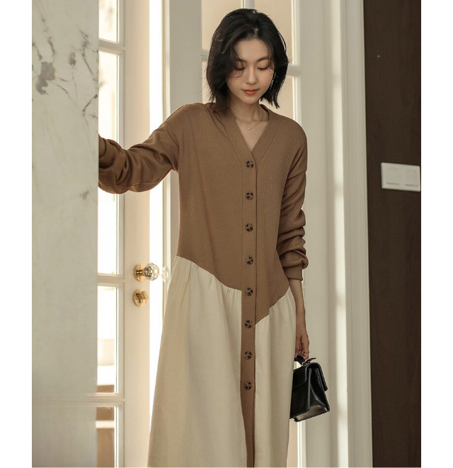 穏やかなトーンで切り替えたカラーブロッキングが、柔らかな印象を引き立てる一枚。