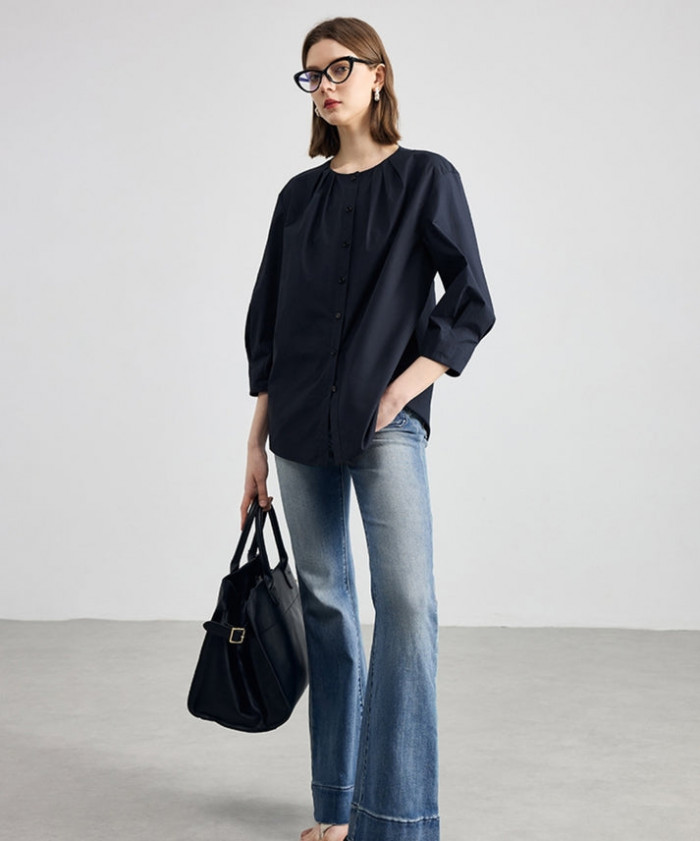 ネイビーカラーのランタンスリーブブラウス。コットン100%の生地なので、優しくふんわり包み込んでくれるような肌触りが魅力的です。デニムパンツとの相性抜群。