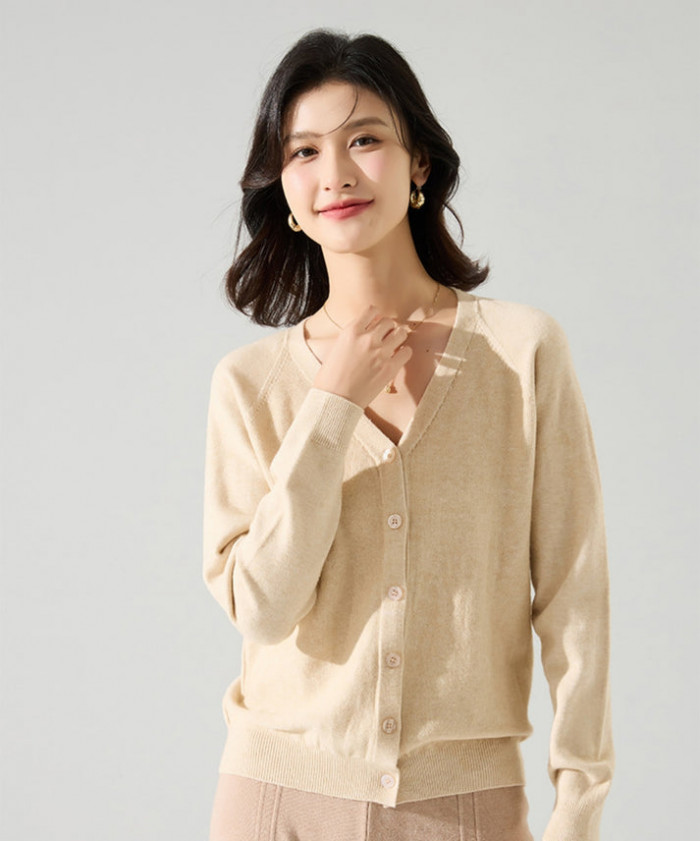 ベージュカラーのVネックニットカーディガン。1枚で着ても重ね着をしても、おしゃれにコーディネートできる優れものです。