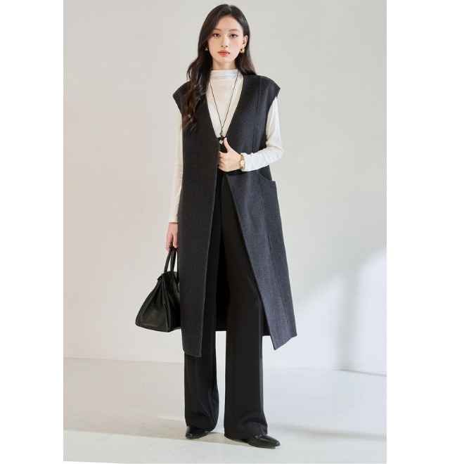 ベストながらもしっかりと長めの着丈に、カシミヤ混紡の高見え素材でコートとしても羽織れる1枚。気温の高い日中に着ていても大げさに見えず、また細身のコートでは収まりにくいボリューム袖のアイテムも存分に愉しめそうです。共布ベルトを巻けばワンピース風に。