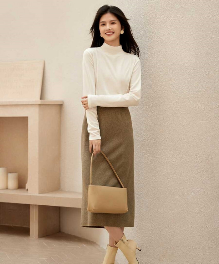 清潔感あるホワイトカラーのハイネックトップス。伸縮性のある生地なので、フィット感ある着心地が快適です。タイトスカートを合わせて、スタイルアップ。