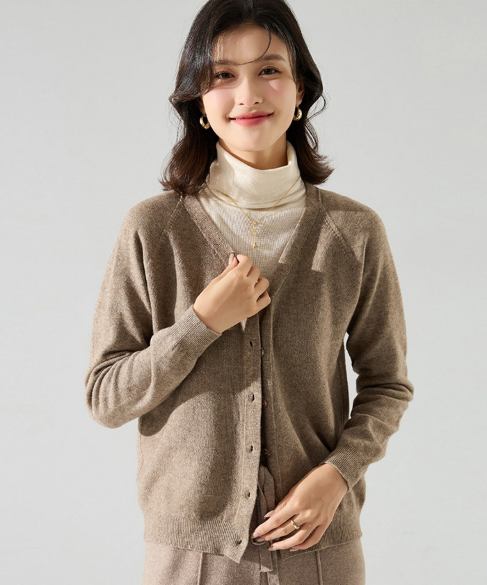 キャメルカラーのVネックニットカーディガン。暖かみのあるカラーで、これからの季節にぴったりです。ハイネックトップスと合わせて、秋らしく。