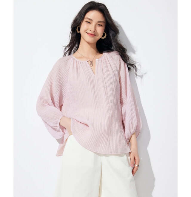 淡いピンクカラーのランタンスリーブブラウス。ふんわりとした袖がアクセントになっています。白のパンツを履いて、爽やかに。