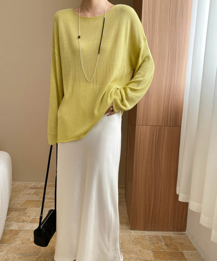 鮮やかなイエローカラーのルーズニット。大きめのサイズ感が、エレガントな印象を与えてくれます。ホワイトのタイトスカートを履いて、スタイルアップ。