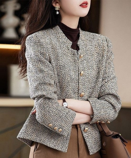 ポリエステルツイードのライトなジャケット。低い位置にポイントを置いたスタンドカラーが、デコルテあたりをすっきりとした印象にしてくれます。