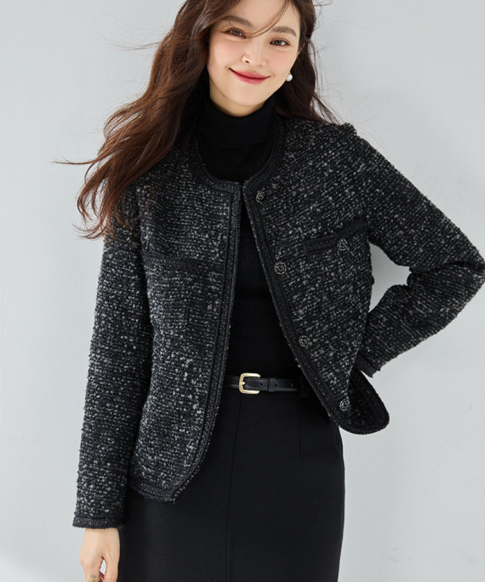 ツイード生地もパイピングもボタンも、全部モノクロでまとめた、シックなジャケット。