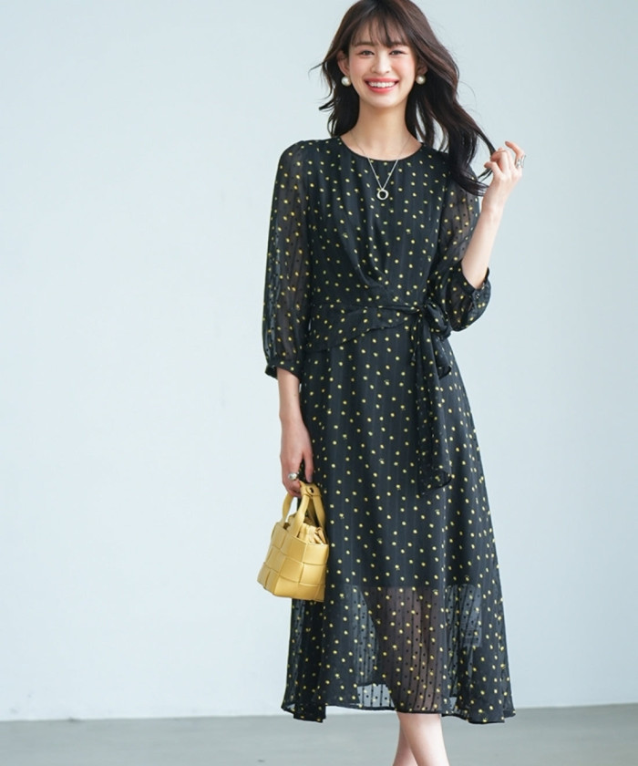 シフォン素材のドット柄ワンピースです。ウエスト部分のリボンがアクセント。袖と裾の透け感がおしゃれです。イエローのバッグを持って、華やかに。