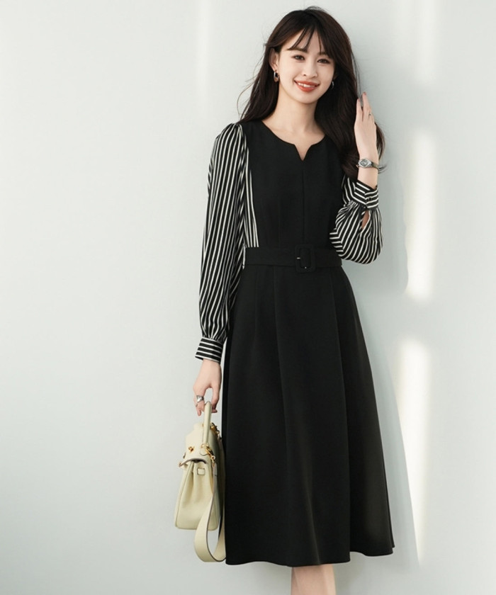 ストライプスリーブがポイントになったコントラストワンピース。キーネックが首元をスッキリと美しく見せてくれます。