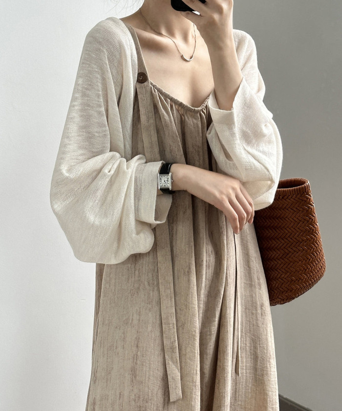 大きめの編み目が特徴のローゲージニットは、肩の力を抜いた雰囲気を演出してくれます。ノースリーブやキャミワンピにさらりと羽織るだけで、今っぽいリラックス感が漂うスタイルに。ベージュやアイボリーを選べば、どんな色のワンピースとも好相性。ウエストに細めベルトを添えて、ゆるさの中にメリハリを出すのもおすすめです。
