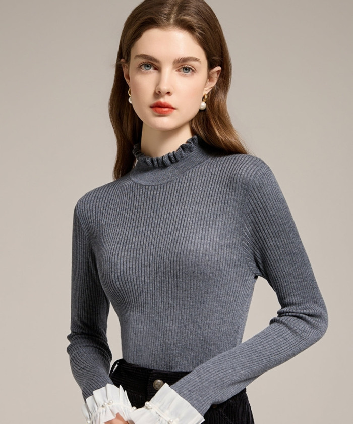 ハイネックのリブニットにフリルをあしらったデザインは、シンプルな中に女性らしさを感じさせる一枚。顔まわりに華やかさを添えつつ、細めのリブが縦ラインを強調してスタイルアップ効果も。淡いグレーなら上品さが際立ち、ブラックやデニムと合わせても重くなりません。コートの襟元から少しフリルをのぞかせると、控えめな甘さが冬コーデに映えます。