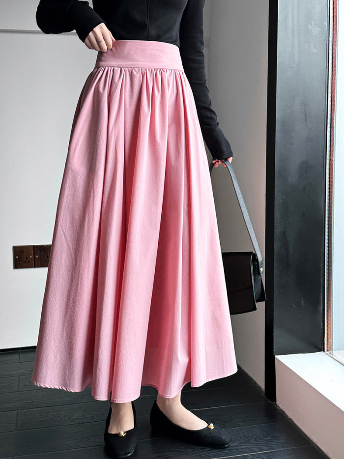 シンプル無地の生地にたっぷりのプリーツを入れて、ドレープ感を出し、優雅な雰囲気を演出したプリーツスカート。生地に光沢感はないものの、プリーツの陰影によって奥行や動きが出て、高級感ある印象で着用することができます。目を惹くピンクの色味は、コーディネートのワンアクセントになります。