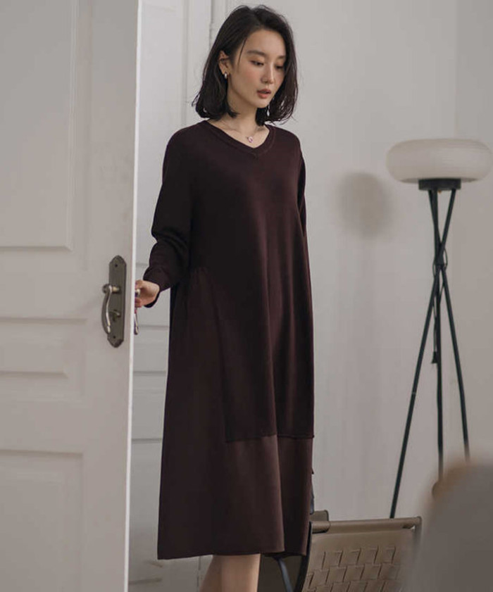 ニットと布帛生地でゆったりスタイルを作ったVネックワンピース。