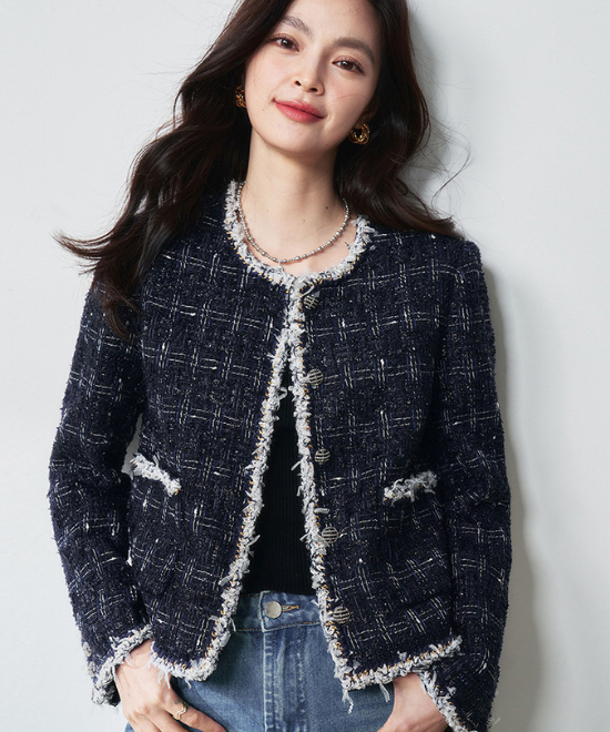 高見えツイードのジャケットに、グレーのモール糸でパイピングを施した、クラフト感ある一枚です。