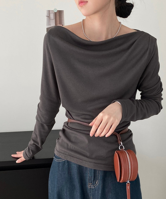 ドレープが生み出す立体感と、オフショルダーの程よい肌見せが大人の余裕を感じさせるニット。チャコール系の落ち着いたトーンが、肌の透明感を引き立てて上品な印象に。シンプルなボトムを合わせてもコーデが決まり、アクセサリーで華やぎを添えるのもおすすめです。タイトスカートやワイドパンツなど、シルエットで遊ぶスタイリングが映える一枚です。