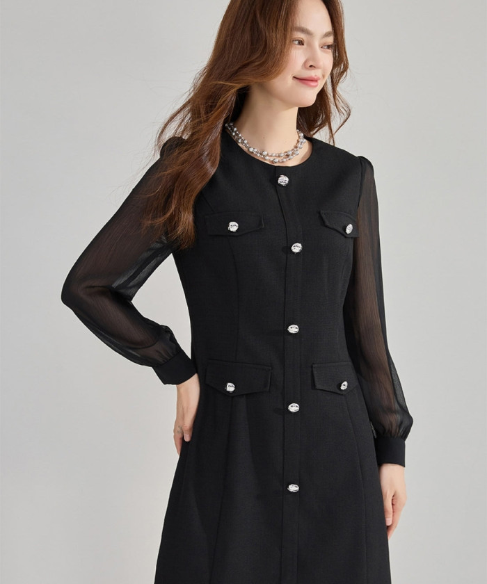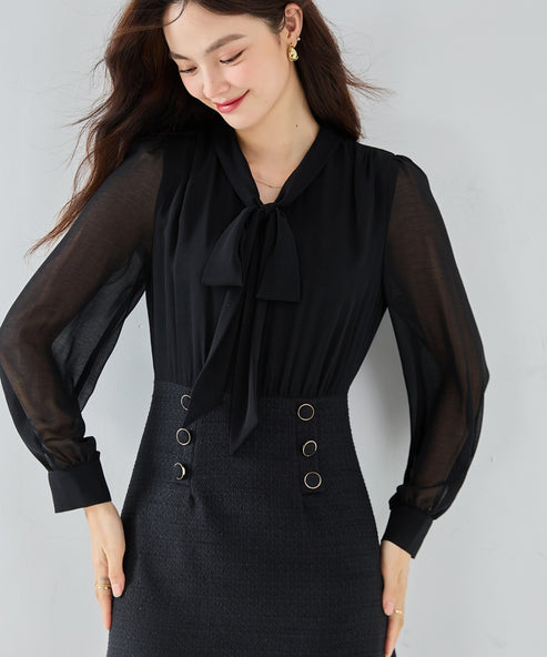 ブラック単色でも、シフォンの袖のシアー感と飾りボタンの艶が、立体感を生み出す一枚。