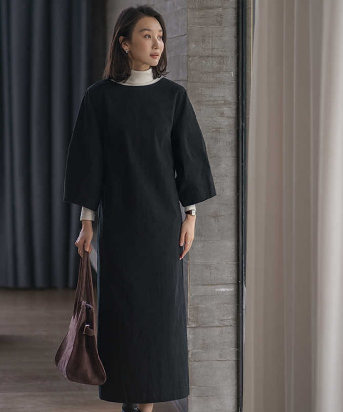 ステッチもボタンもない究極にシンプルなデザインながらも唯一袖にボリュームを持たせたワンピース。インナーを程よく見せられる七分袖も絶妙です。ゆるっとラフに着るのもいいけれど、インナーにホワイトを選べばコントラストの美しいハイセンスな着こなしに。