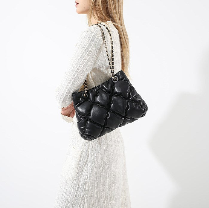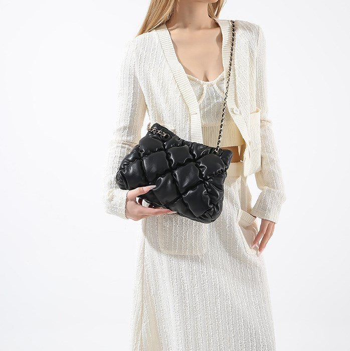 洗練されたフォルムと光沢感が、シンプルコーデを格上げしてくれるチェーンバッグ。小ぶりながら存在感があり、斜め掛けすれば程よい抜け感も。チェーンのきらめきがイルミネーションの光と重なり、冬の夜にぴったりな雰囲気を演出します。レストランデートや特別な日の装いにも相性抜群です。