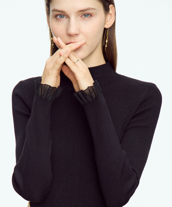 袖にレイヤード風デザインをあしらったデザインニット。細やかなリブ編みが身体のラインをすっきり見せ、ジャケットやジレを羽織ってももたつかないシルエットです。インナーとして着ることで、袖口から見えるレイヤードディテールがさりげないアクセントに。ウールやツイード素材のアウターと合わせると、立体感のあるきれいめレイヤードが完成します。
