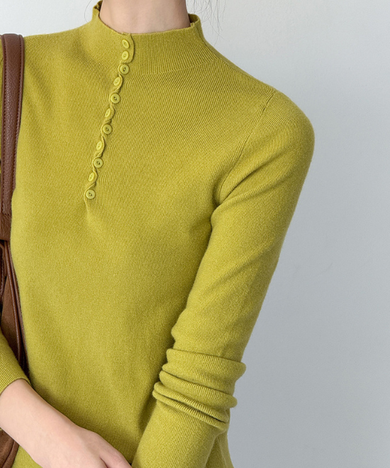 首まわりのボタンデザインがポイントのウールニット。薄手ながらしっかりとした素材感で、アウターを羽織ってもごわつかずきれいに収まります。ボタンを少し開けてインナーのハイネックをちらりと見せると、上品な抜け感が生まれます。程よい温もりを持ちつつ、軽やかに重ねられる万能ニットです。