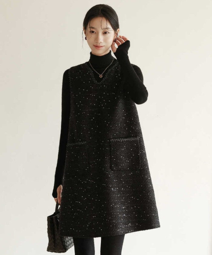 ウール混素材のほどよい厚みと、深めのVネックラインが特徴。タートルニットを重ねることで首元の抜け感が生まれ、顔まわりがすっきり見えます。フレア気味の裾が歩くたびに揺れて、女性らしさをさりげなく演出。ロングブーツを合わせると、クラシカルで上品な冬コーデに仕上がります。