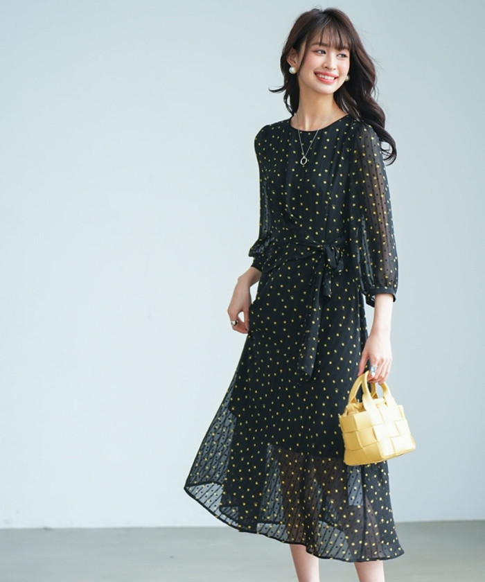細かなドット柄と軽やかなシフォン素材が女性らしさを引き立てる一枚。ウエストリボンをきゅっと結ぶと自然なメリハリが生まれ、スタイルアップ効果も抜群です。ジャケットを羽織ればきちんと感が出てオフィスにもぴったり。仕事終わりはアクセサリーを足すだけで、フェミニンなディナースタイルに早変わりします。