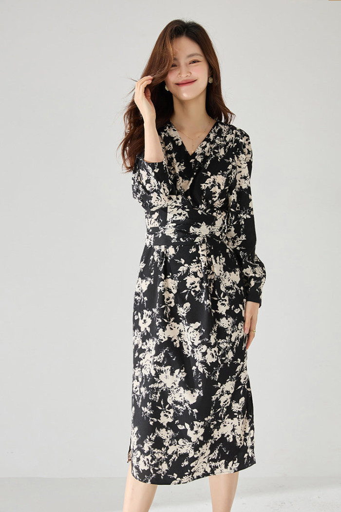 落ち着いた華やかさをまとう「Vネック花柄ワンピース」