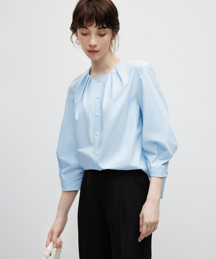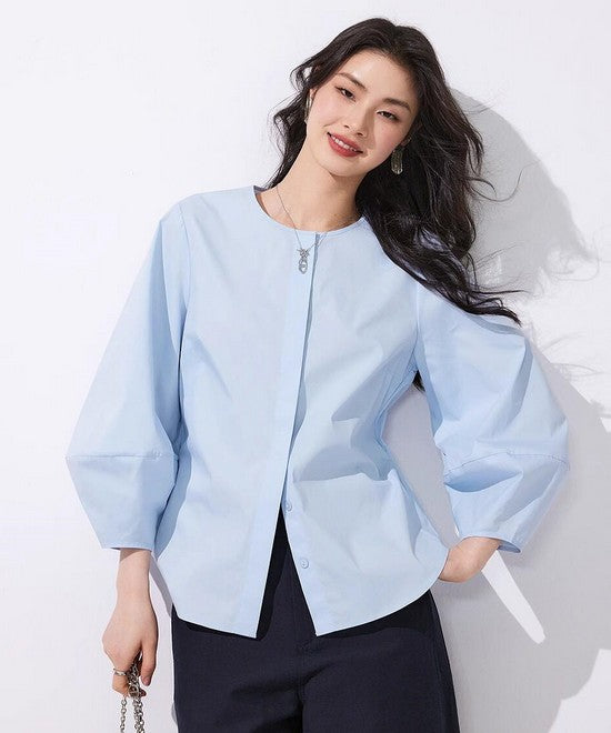 シンプルな身頃に、切り替えで立体を作ったベルスリーブが個性的なノーカラーシャツ。