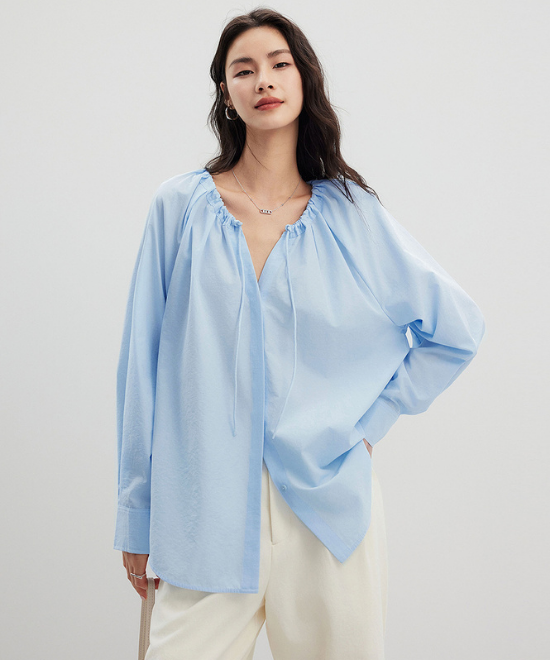 変形ラグランで柔らかな女性らしいラインを作った、スキッパーシャツ。