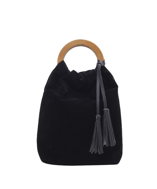 大きめのタッセルと丸い持ち手がポイントの手提げバッグ。