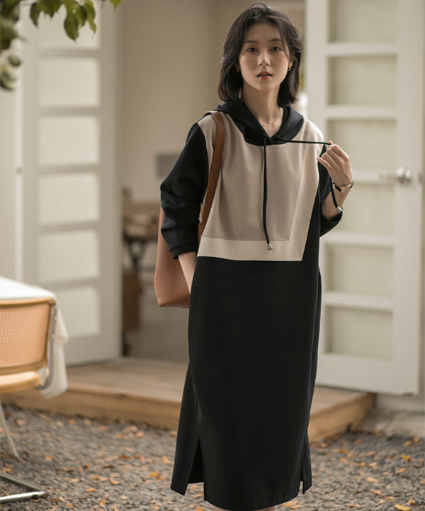 らくちんな反面、カジュアルイメージの強いフード付きのスウェットワンピース。ブラックでも幼く見えてしまいそうですが、そこにベージュを足すことでちょっと上品に。こなれた大人の日常スタイルに着地します。スカーフやベストを重ねたようなデザインが斬新。