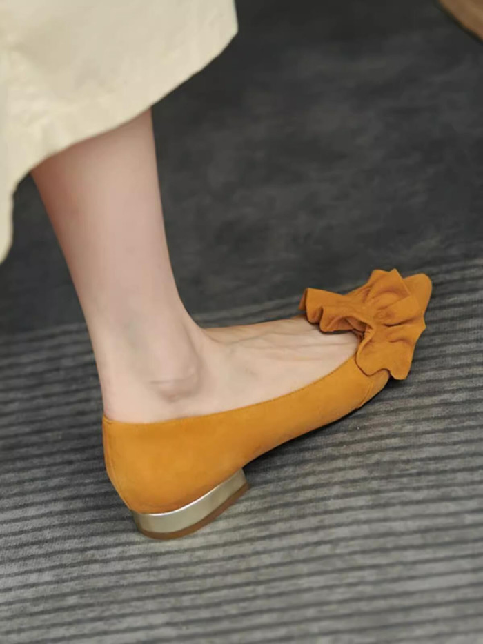まるで秋に実る柿のような色味のパンプスは、コーデに取り入れるだけで旬な装いになります。ダークカラーになりがちな秋コーデの中でアクセントにもなるので、1足あると便利。ローヒールなので、おしゃれなのに歩きやすさも抜群です。フロント部分のフリルがフェミニンさもプラスし、きれいめコーデにもぴったり。