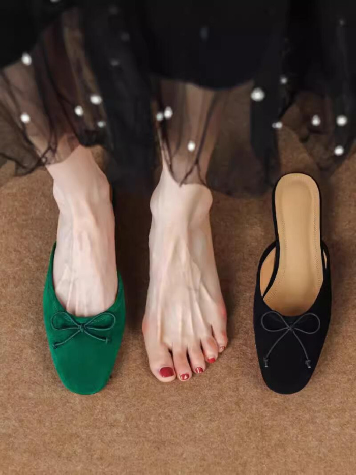 かかとのないミュールタイプのパンプスなら、足元に抜け感を演出できます。出かけるときに気負いせずサッと履けるのも魅力的。シックな雰囲気のある深めのグリーンとブラックの2色は、どちらも秋の装いと相性抜群です。さりげなくリボンをあしらい、かわいらしさもプラスします。