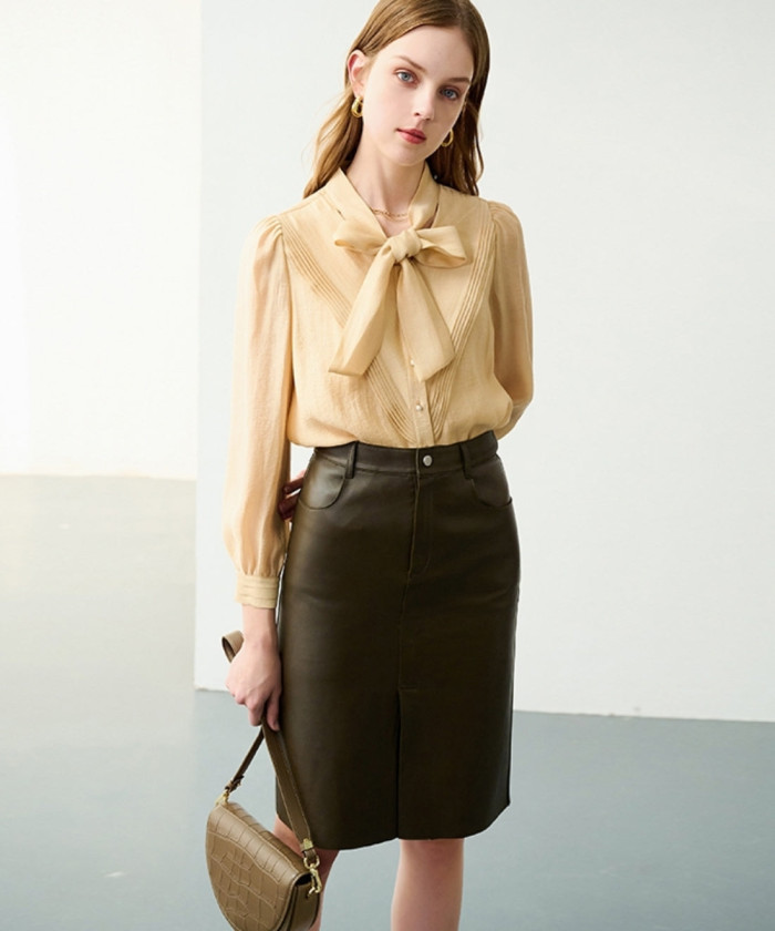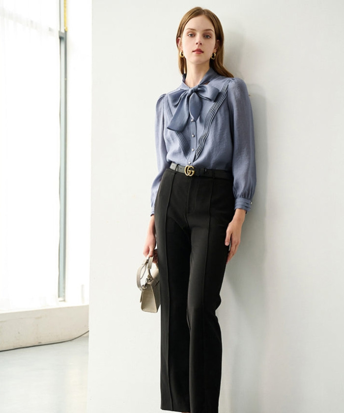 カーディガンやジャケットとレイヤードしても可愛いボウタイブラウス。