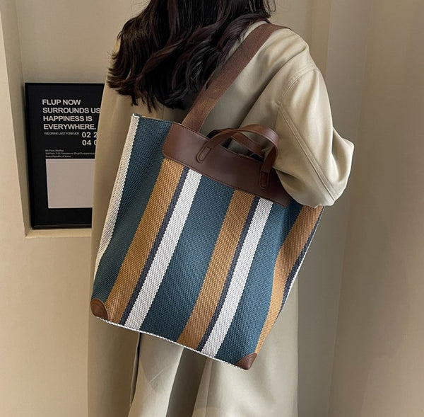 とにかく荷物をたくさん入れたい、そんな時に思い浮かべるのはキャンバス地のトートバッグ。ただ夏っぽくなってしまいそうでちょっと困る。そんな悩みを解決するのがこちら。レトロ感のあるブルー×カーキのストライプ柄にレザーの持ち手で秋らしさ満載です。