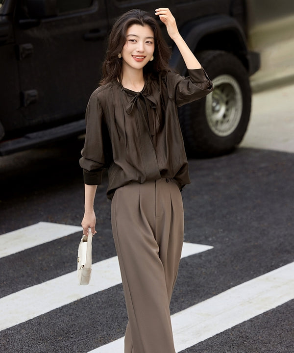 今季大人気のブラウンを上下ともに使ったトレンド感満載のコーデ。それだけでもお洒落ですが、さらっとしたブラウスにしっとり感のあるスラックス、その素材のギャップにもセンスが光る。渋めのコーヒーブラウンとグレージュ寄りの柔らかい色味との濃淡がまた美しい。