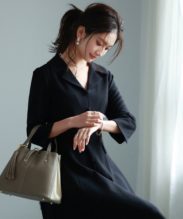 テーラード襟とフィット感のあるラインが印象的なクラシカルワンピース。ボディラインをさりげなく引き立てつつ、上品な佇まいを演出します。ジャケットを羽織らなくてもフォーマルな印象が完成し、ディナーや式典などにも最適。クラシカルな雰囲気の中に、芯のある美しさが漂います。
