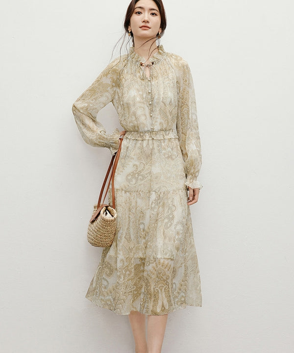 くすみグリーンにペイズリー柄、首元のビーズ飾りがフォークロア調のワンピース。1枚でも存在感はありますが、レザーやダメージデニム、フェイクファーなど羽織の工夫次第でもっとフォークロアに寄せることも可能です。普段には、ジャケット合わせできれいめに。