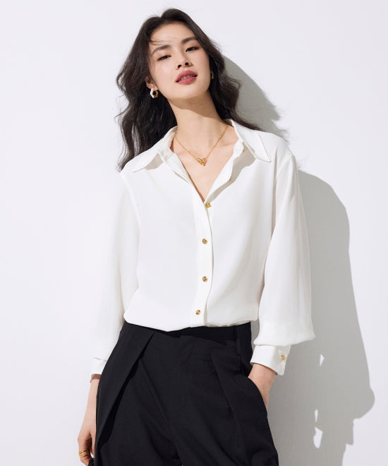 品のあるツヤが魅力「ゴールドボタン長袖シャツ」