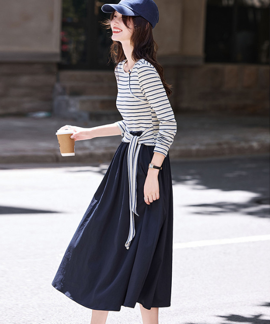 自然にウエスト位置が高く見えるため、スタイルアップ効果も抜群です。ボーダーの軽やかさと無地のフレアの組み合わせが、大人の女性らしさを引き立てます。1枚でバランスの取れた美シルエットが完成する、頼れるワンピースです。