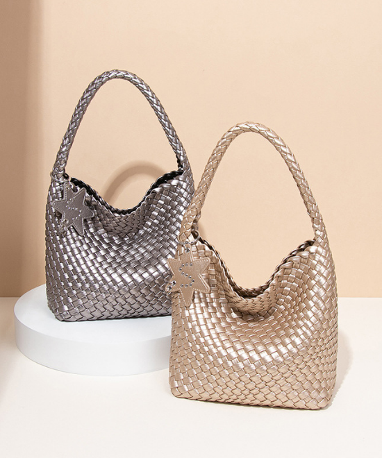 シンプルなスタイルにこそ映える、存在感のある手織りテクスチャーのハンドバッグ。