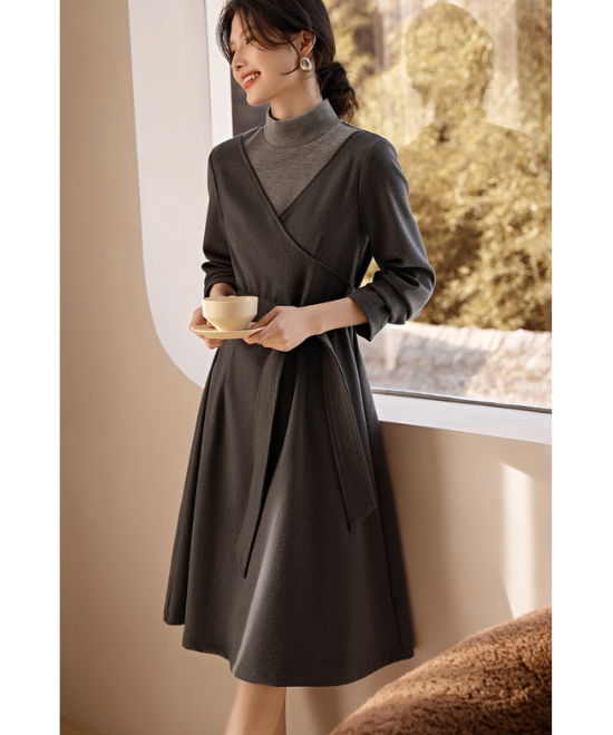 暖かなセミタートルネックの、シンプルなワンピース。細いベルトがアクセントです。