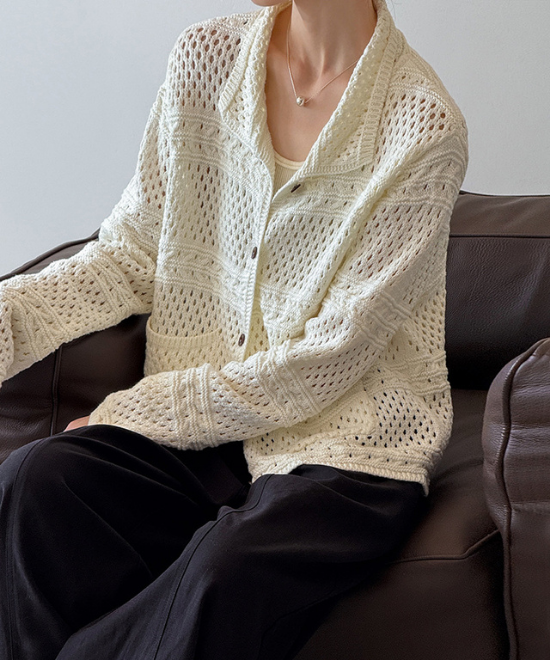 羽織りとしてはもちろん、前のボタンを閉めてトップスとしても使えるこちらのカーディガン。抜け感あるカギ編みデザインがかわいらしく、ブラウンのボタンがレトロなアクセントに。