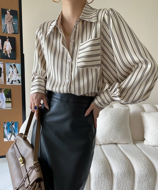 スリーブのたっぷりとしたルーズシルエットが魅力のこちらのシャツ。ダブルとシングルラインのストライプが遊び心を感じさせます。やや光沢感のある質感できれいめスタイルにもぴったり。