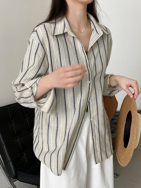 レトロなストライプデザインがユニークなこちらのシャツ。前ボタンを閉めてトップスとしてはもちろん、羽織りに使ったスタイルもお洒落。袖は数回まくって手首を出すと、女性らしさもしっかり感じられる華奢見えスタイルに。