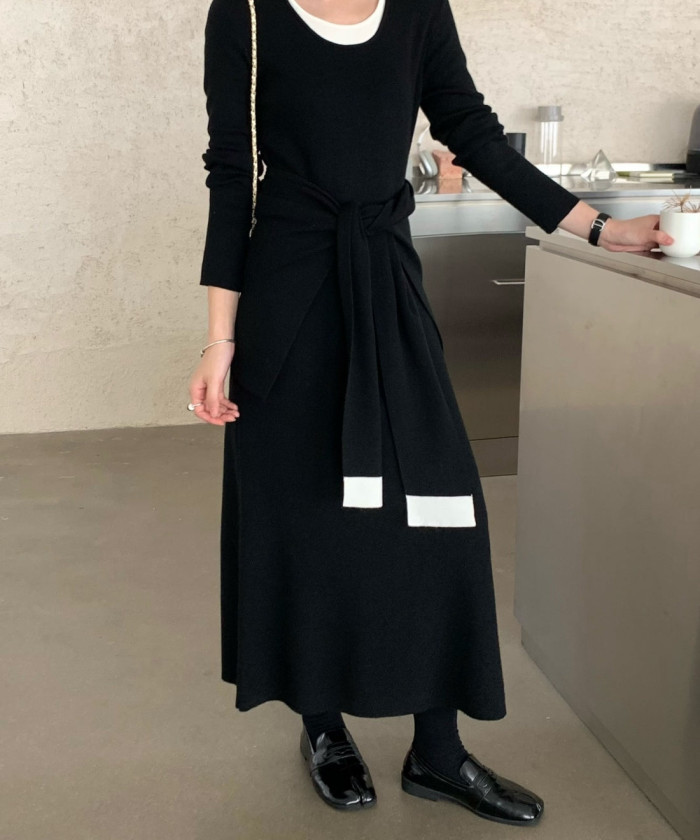 ブラックでロング丈、となればかしこまってしまいそうですが、こちらはTシャツにレイヤードしたようなデザインが親しみやすい。付属のショールはカーディガン風。腰に巻く他、肩にかけてもお洒落です。ショールの先端にもホワイトをあしらい、メリハリも効いた1枚。