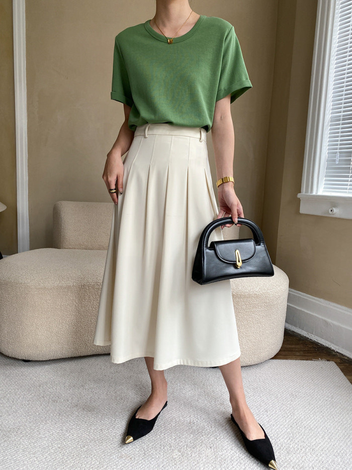 程よく体に沿うシルエットと、柔らかなニット素材が魅力の一枚。アウターを羽織ってももたつかず、ジャケットやカーディガンのインナーとして活躍します。グリーンを選べば、シンプルなスタイリングにもぐっと洒落感がプラス。ベージュやグレーのパンツと合わせて、軽やかで品のある秋カジュアルに。